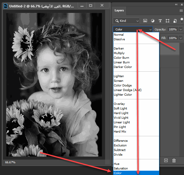 السلام عليكم عزل جزءلون من الصوره بشكل اسهل شرح واعداد : نظرهـ خجولهـ البدايهه نختار صورهه حابينها طيب يااحبهه وانااخترت هالصورراح اعزل منهاجزء من الصوره راح نفتح الان لير اي طبقه جديدة اللي مشار اليه باللون الاحمر ونختار اداة لدلواو التعبئه نفس الكلمه ونعبيه باللون الآبيض تمام راح تتغطى الصوره كامل باللون الأبيض هالشكل تمام ونختار بعد كذالمودالمشار الية باللون الاحمر وراح تقلب الصوره الئ ابيض اسودهالشكل الان راح نختاراداة الممحاة ناعمة وراح يكون القياس لها 100 مثل ماهو موضح قدمنا اوكيهه نجي الحين ونمحي بالصوره اللي حابين يكون ملون اي جزء حابينه طيب راح اختر الورده اللي بيد البنوتهه الصوره قبل الصورة بعد https://up.jo1sat.net/do.php?img=3500 الصوره ق الصورة ب https://up.jo1sat.net/do.php?img=3499 وبكذاأنتهينــا وتم الدرس بحمد الله يارب اكون سهلت عليكم بالشرح بدون كلل ولا ملل ودايم بحول الله تعالئ االجايات أجمل لكم :181: |