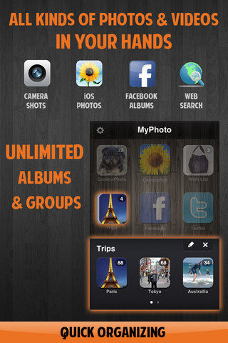تطبيق MyPhoto Albums هو أحد تطبيقات الصور في متجر البرامج وتم اختياره كأحد أفضل برامج الصور في 2010 حيث أنه يجمع بين مزايا عدد من البرامج حيث أنه يعتبر برنامج حفظ الصور وتنظيمها في مجلدات مختلفه وأيضاً يمكن وضع كلمة مرور لحماية الصور داخل التطبيق، أو يمكن وضع الحماية على مجلدات معينه فقط، الميزة الأخرى لهذا التطبيق هى إمكانية التعديل على الصور مثل برامج إنستغرام وكاميرا بلاس وغيرها من البرامج التى تمكنك من إضافة مؤثرات كثيره على الصور، كما يوجد ميزة أخرى وهى أنه يمكنك إضافة الصور للتطبيق من الفيس بوك أو تويتر مباشرة للتطبيق كما تستطيع البحث عن الصور على الإنترنت من داخل البرنامج مباشرة، تطبيق جيد وهو مجاني لفترة قصيرة جداً.