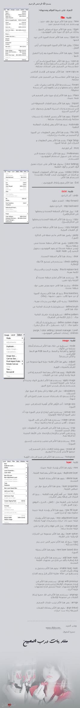 كيفكم يامبدعين إنشاء الله طيبين:d في هذا الموضوعراح نتكلم عن قوائم الفوتوشوب وكل ما تحتويه هذا القوائم وعمل كل منها لا نها سوفر تساعدك من فهم الفوتوشوب وايضا سوفى تختصر الوقت وعمل كل ما ترغب به وفهم الفوتوشوب ...<لن في ناس الفوتوشوب ما دخل مخخهم صعب إلخ... ولكن لعلمكـ بان الفوتوشوب هو ايضا ابداع مثله مثل اي فن فالشاعر يصوره الشاعر بالكتابه وانت تصور بتصميمك وما تظهر من جماليات وابداع وتألق . الشرح في المرفقات انا شرحت اربع قوائم فقط والباقي في الطريق وارجوا الفائدة
