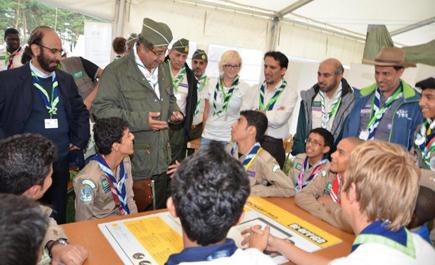 الجزيرة- عبدالرحمن اليوسف قام سمو الأمير فيصل بن عبد الله بن محمد رئيس جمعية الكشافة العربية السعودية وزير التربية والتعليم بزيارة للمخيم الكشفي العالمي الثاني والعشرين المقام بمدينة كريستيانستناد السويدية، حيث التقى عند وصوله في مخيم التشريفات والمراسم مندوب ملك السويد الرئيس الفخري للصندوق الكشفي العالمي السيد جون قيقان، والسيد سيمون ري رئيس اللجنة الكشفية العالمية، ومديرة ومديري المخيم السيدة ماري رينيكه، والسيد لاسي كارلسون، والسيد غوران هيغيردال، ثم انتقل سموه إلى مقر الوفد السعودي حيث عزفت الفرقة الكشفية الموسيقية للجمعية السلام الوطني، ثم التقى الأمير فيصل بقادة الوفد السعودي في بيت الشعر الذي أقامته الجمعية بمناسبة المخيم العالمي. بعد ذلك قام سموه بزيارة للمعرض الكشفي السعودي وتجول في أجنحته وأركانه، ثم قام والمسؤولون في الكشفية العالمية بزيارة لمقر الحوار الوطني الذي تقيمه الجمعية بالتعاون مع مركز الملك عبد العزيز للحوار الوطني والتقى الكشافة والجوالة الموجودين في المقر وتجاذب أطراف الحديث معهم عن أهمية الحوار، بعدها زار مقر مخيم رسل السلام، قبل أن يختم زيارته بالاطلاع على القرى العالمية وما يقدمه كشافة المملكة هناك من عرض للتراث السعودي، والضيافة العربية، والتعرف على الصناعات التقليدية الشعبية والتدريب على كتابة اللغة العربية.